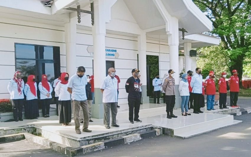 Wakapolres Gowa Kompol Muh Fajhri Mustafa yang mewakili Kapolres Gowa AKBP Boy F.S Samola menghadiri Apel Kesiapan Penyemprotan Disinfektan yang digelar serentak oleh PMI pada Sabtu (05/06/2020).