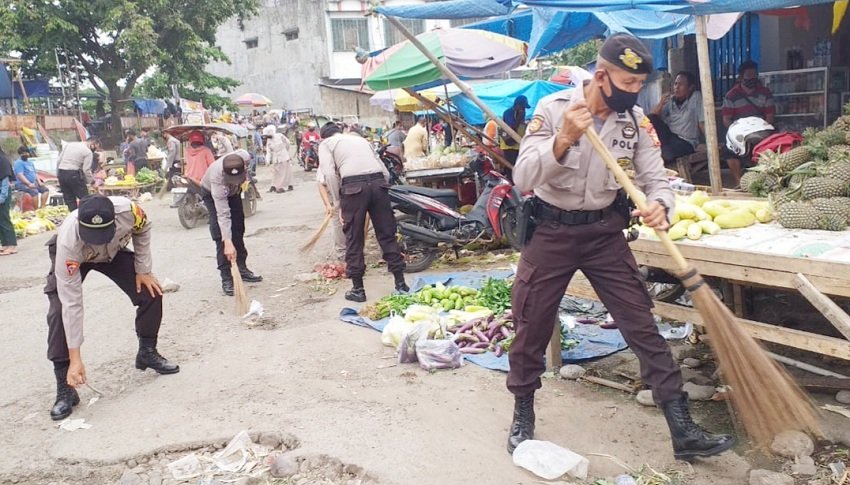 Memperingati Hari Bhayangkara ke-74 tahun 2020, personil Polres Gowa usai mengikuti apel pagi pada Jumat (19/06/2020) langsung menggelar kegiatan kerja bakti dengan menyasar ruang publik seperti pasar.