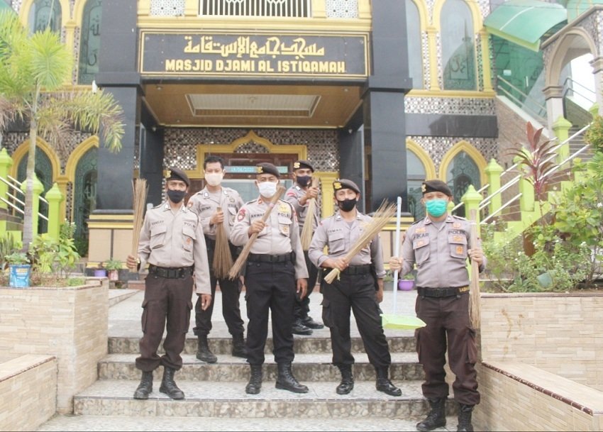 Menyambut Hari Bhayangkara ke-74, personil Satuan Sabhara Polres Gowa menggelar bakti sosial dengan membersihkan tempat ibadah, Jumat (19/06/2020).