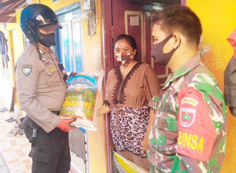 Untuk meringankan beban ekonomi warga masyarakat di masa pandemi Covid-19, Bhabinkamtibmas Kelurahan Patingalloang Baru Bripka Firman bersama Babinsa menyerahkan bantuan beras kepada warga binaannya di Jalan Barukang VI Kecamatan Ujung Tanah, Senin (22/06/2020).