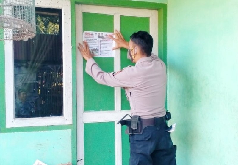 Bhabinkamtibmas Polsek Bontonompo Polres Gowa Bripka Safri menempel selebaran tentang penbentukan Kampung Rewako di rumah warga, Selasa (23/06/2020).