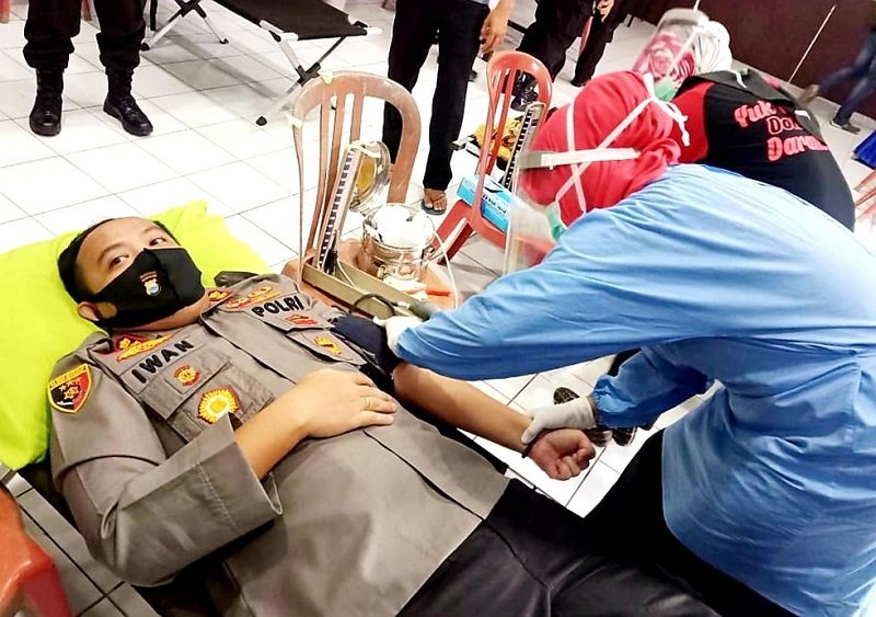 Pada pelaksanaan donor darah tersebut, personil mengatur waktu masuk ke ruangan donor secara bergiliran dan yang lebih penting personil yang hendak mendonorkan darahnya telah dipastikan sehat fisik. (AaN)