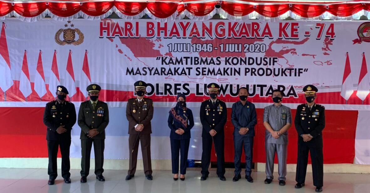 Dalam upacara Hari Bhayangkara ke-74 dihadiri para Forkopimda yakni, Bupati Lutra Hj. Indah Putri Indriani, Kapolres Lutra AKBP Agung Danargito, Dandim 1403 Sawerigading diwakili Perwira Penghubung (Pabung) Lutra Mayor Czi Syafaruddin, Wakapolres Lutra Kompol H, Amir Majid, Danki Brimob Kompi 3 Yon B Pelopor Baebunta AKP Laode Rusli, SE. Ketua DPRD Lutra, Drs Basir, Kajari Lutra Indawan Kuswadi, SH, MH, Ketua Pengadilan Negeri Lutra Oki Basuki Rahmat, SH, MH serta para PJU Polres Luwu Utara.