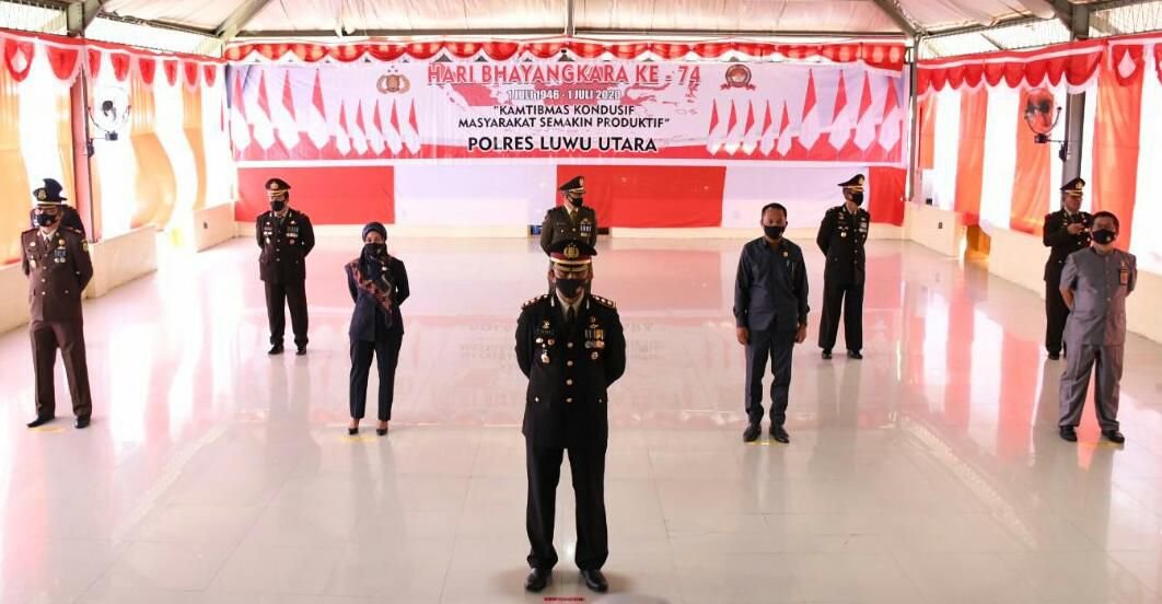 Untuk peringatan Hari Ulang Tahun (HUT) ke-74 Bhayangkara di masa Pandemi Covid-19 berbeda dengan tahun-tahun lalu. Rabu (1/7/2020), Forkopimda Luwu Utara (Lutra) mengikuti upacara Hari Bhayangkara secara virtual di Aula Mapolres Luwu Utara dan pesertanya terbatas.
