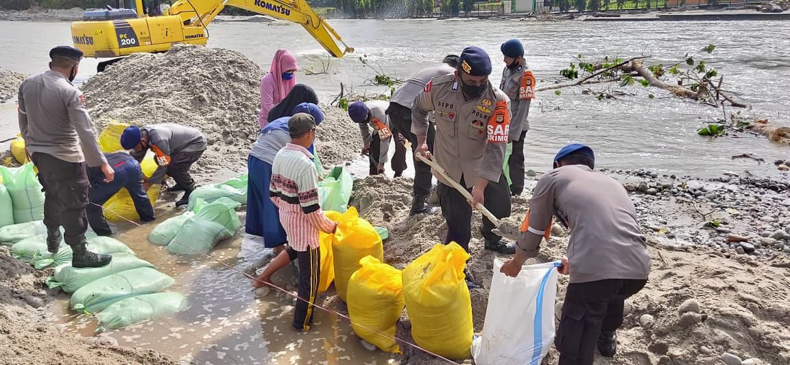 Bersama unsur dari pemerintahan, BPBD Lutra serta personel TNI dari Koramil 1403/Sawerigading, dan Brimob Baebunta bergotong royong membuat tanggul di sepanjang bantaran sungai Masamba untuk mencegah meluapnya air yang mengakibatkan banjir, Kamis (2/7/2020).
