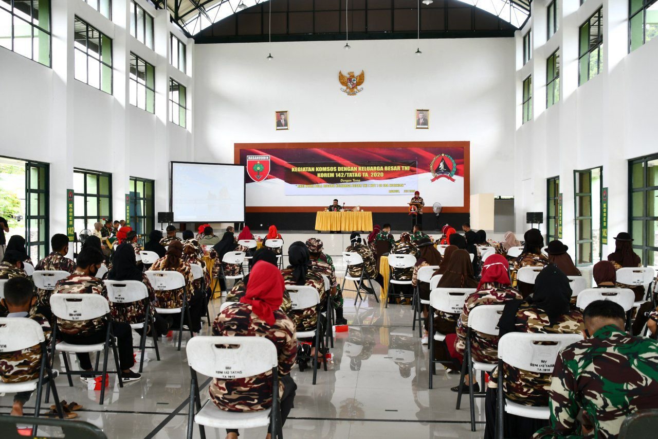 Komsos TNI dengan KBT mengangkat tema "Aksi Nyata Bela Negara Keluarga Besar TNI (KBT) dalam Era Kekinian" tetap mengikuti protokol Covid-19 dengan menggunakan masker, dihadiri Danrem 142/Tatag Brigjen TNI Firman Dahlan, S.I.P, para Kasi Korem 142/Tatag, Sekretaris PD XXXIII FKPPI Sulbar Ny. Nurmilu, para pengurus FKPPI Sulbar dan anggota.