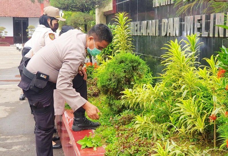 Dalam menjaga kebersihan dan keindahan Mako Polres Gowa, personil Polres Gowa melakukan pembersihan dan perawatan tanaman di lingkungan Mako agar tetap bersih, hijau, indah, dan asri, Sabtu (11/07/2020).