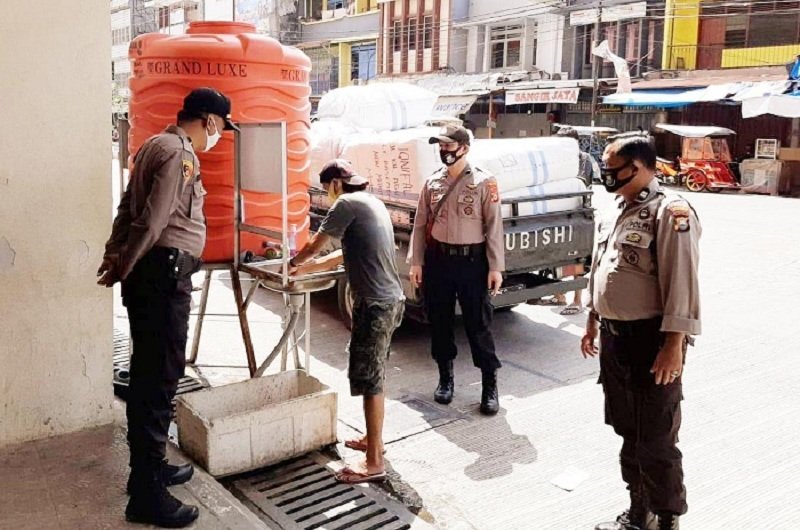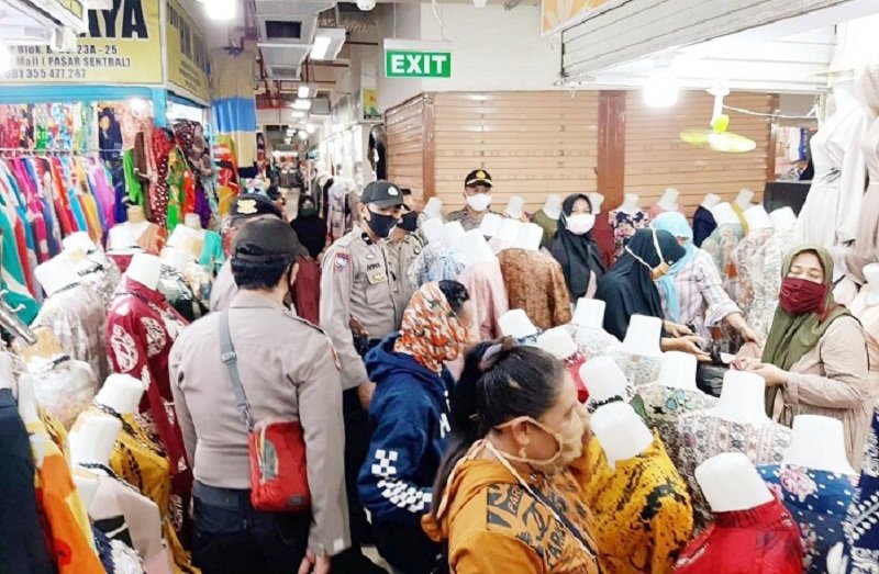 Meski hari ini merupakan hari libur, personel Polres Pelabuhan Makassar yang terlibat di Operasi Aman Nusa II tetap melakukan pengecekan penerapan protokol kesehatan di tempat pusat perbelanjaan Pasar Butung, Minggu (12/07/2020).