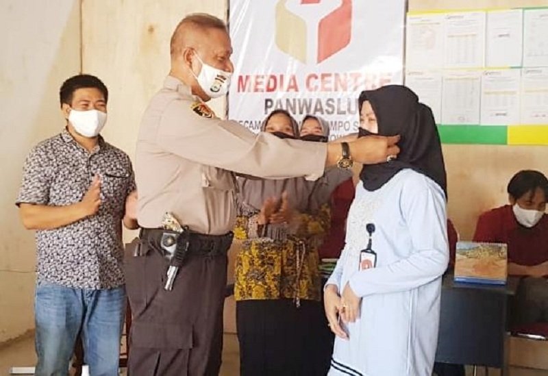Iptu H. Abdullah kemudian menyerahkan dan memasangkan masker kepada petugas pengawas lapangan (PPL) sekaligus mengajak berperan serta membantu pemerintah untuk memberi edukasi kepada warga supaya dapat beradaptasi dengan kebiasaan baru seperti saat ini.