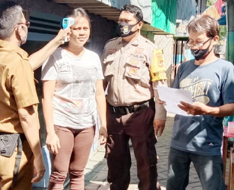 Kegiatan memberikan imbauan protokol kesehatan dan pengecekan suhu tubuh dilakukan di lorong lorong pemukiman penduduk guna memutus mata rantai penyebaran virus Corona atau Covid-19.