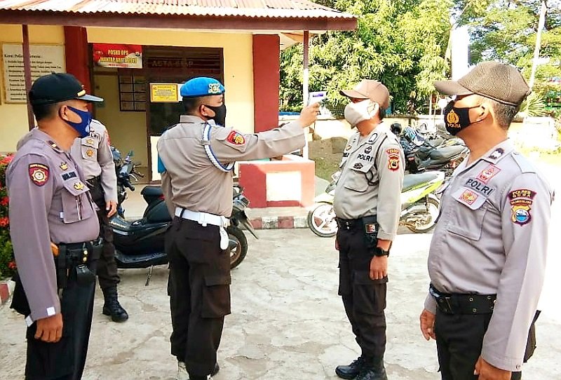 Untuk mengantisipasi penyebaran virus Corona di kalangan personil Polsek Bontonompo Polres Gowa, dilakukan pemeriksaan suhu tubuh setiap personel Polsek Bontonompo, Kamis (16/07/2020).