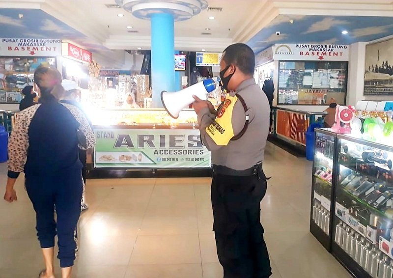 Guna memutuskan mata rantai penyebaran Covid-19, personel Polres Pelabuhan Makassar yang terlibat di Operasi Aman Nusa II mengecek penerapan protokol kesehatan di pusat perbelanjaan Pasar Butung, Kamis (16/07/2020).