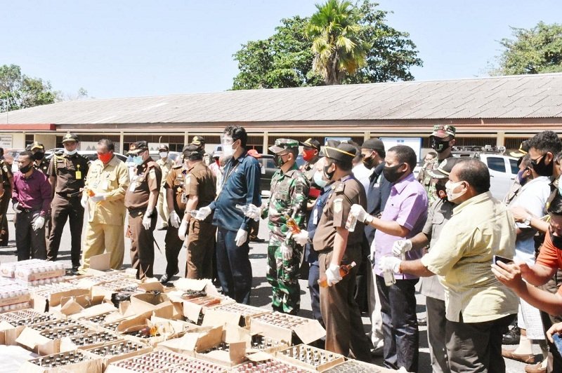 Mewakili kehadiran Pangdam XVIII Kasuari, Asintel Kasdam XVIII Kasuari, Kolonel Kav Urip Prihatman mengikuti acara pemusnahan barang bukti sitaan 4.041 botol minuman keras (miras), Senin (20/07/2020) di halaman Kantor Kejaksaan Tinggi (Kejati) Provinsi Papua Barat, Manokwari, Papua Barat.