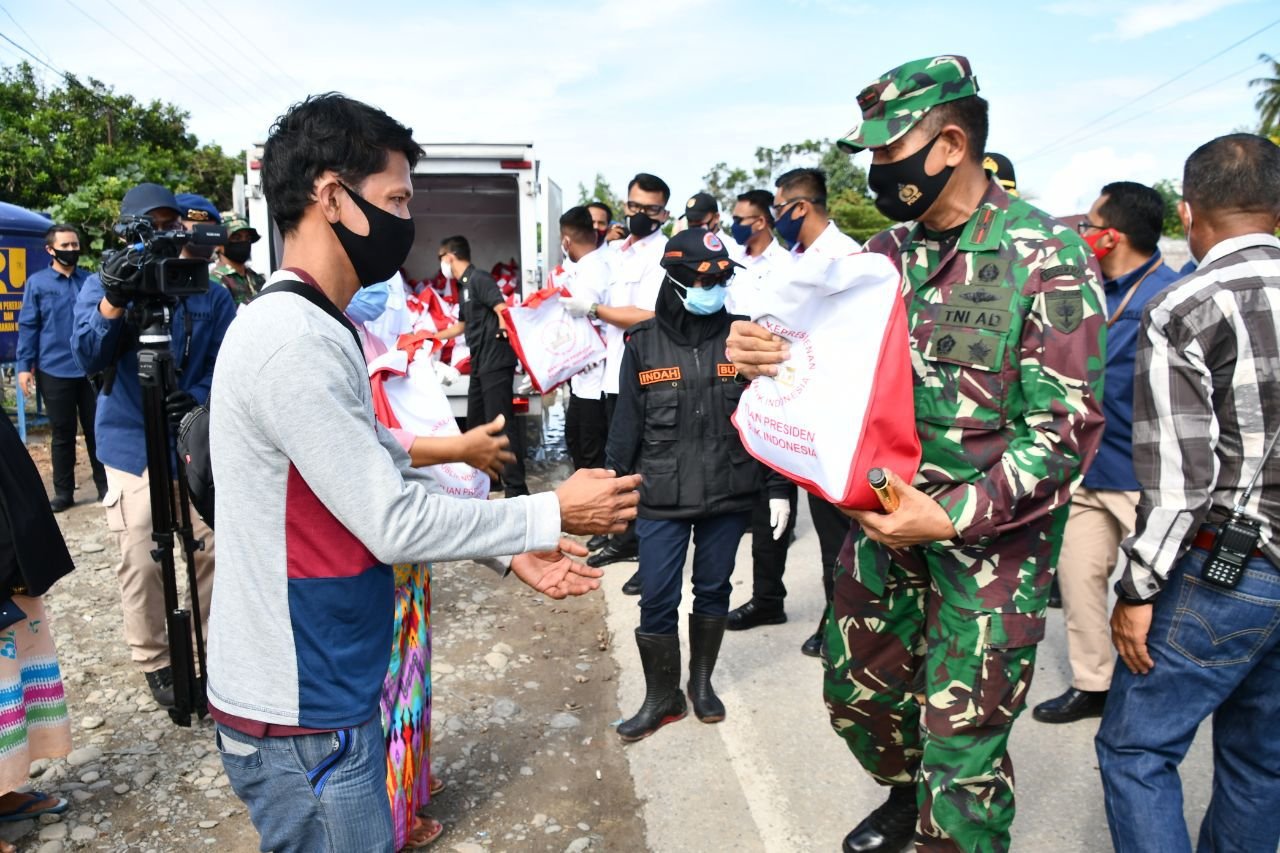 Penyaluran bingkisan sembako dari Presiden Republik Indonesia diserahkan langsung Kepala Bagian Administrasi dan Undangan Sekretariat Presiden, Wahyudi kepada korban banjir bandang di Posko Kodim 1403/Sawerigading, disaksikan Danrem 142/Tatag Brigjen TNI Firman Dahlan, S.I.P., Bupati Luwu Utara Hj. Indah Putri Indriani, S.IP, Dandim 1403/Sawerigading Letkol Inf. Gunawan, S.IP, Kapolres Luwu Utara dan sejumlah kepala desa.