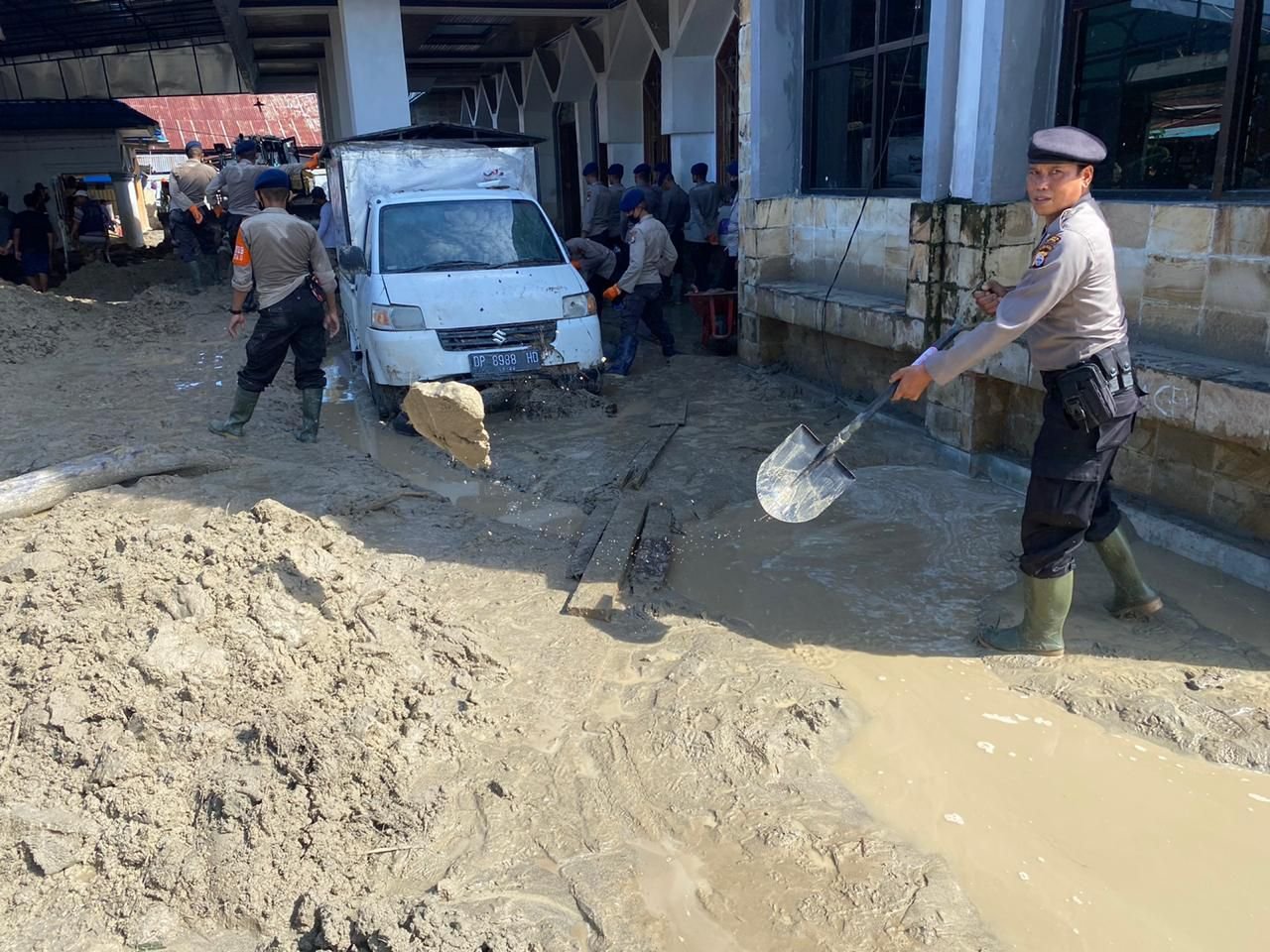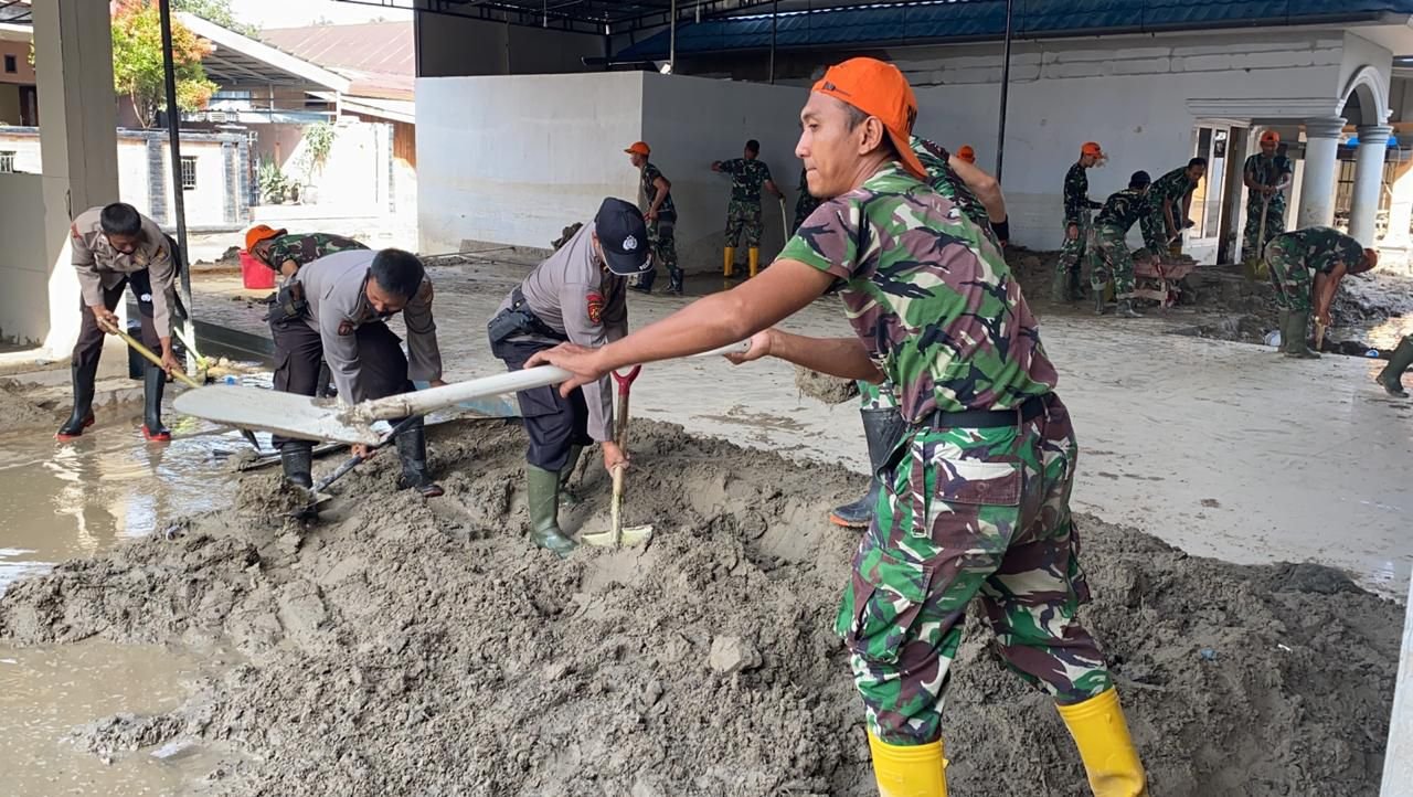 Pasca banjir yang menerjang ratusan rumah warga di Luwu Utara (Lutra) Sulawesi Selatan (Sulsel), aparat gabungan TNI-Polri langsung ke lokasi banjir. Selain melakukan pembersihan di area Masjid Syuhada, juga membantu warga yang rumahnya terdampak banjir, Rabu (22/7/2020).