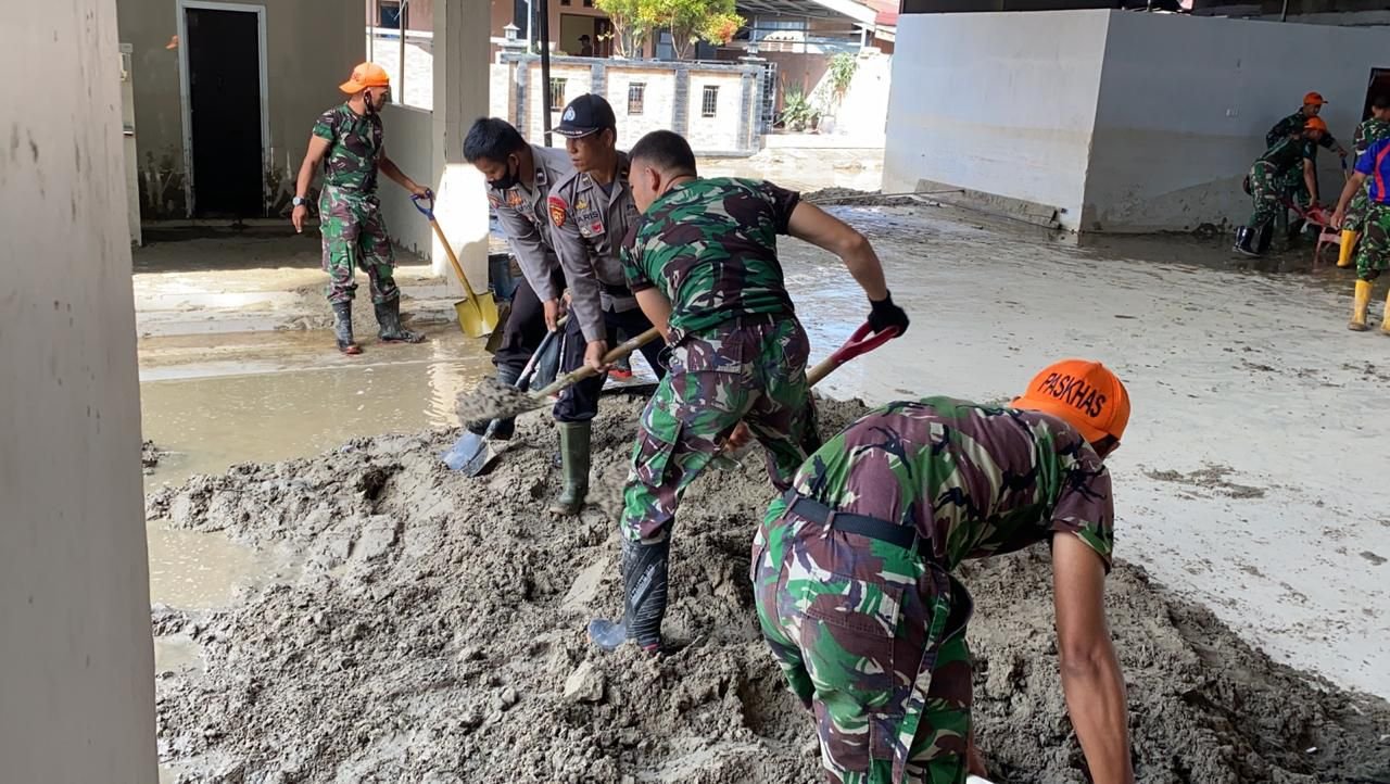 Aparat TNI Polri diterjunkan ke Kota Masamba karena pasca-banjir, ratusan rumah warga di Lutra itu masih dipenuhi lumpur dan material kayu.