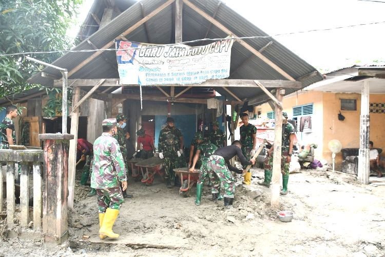 "Kita bersihkan lumpur yang tertimbun dalam rumah maupun di halaman, dengan harapan saudara-saudara kita yang masih berada di pengungsian dapat kembali beraktifitas di rumahnya," ucap Kasi Ops Rem 142/Tatag Letkol Inf. Rudi Setyawan, SE