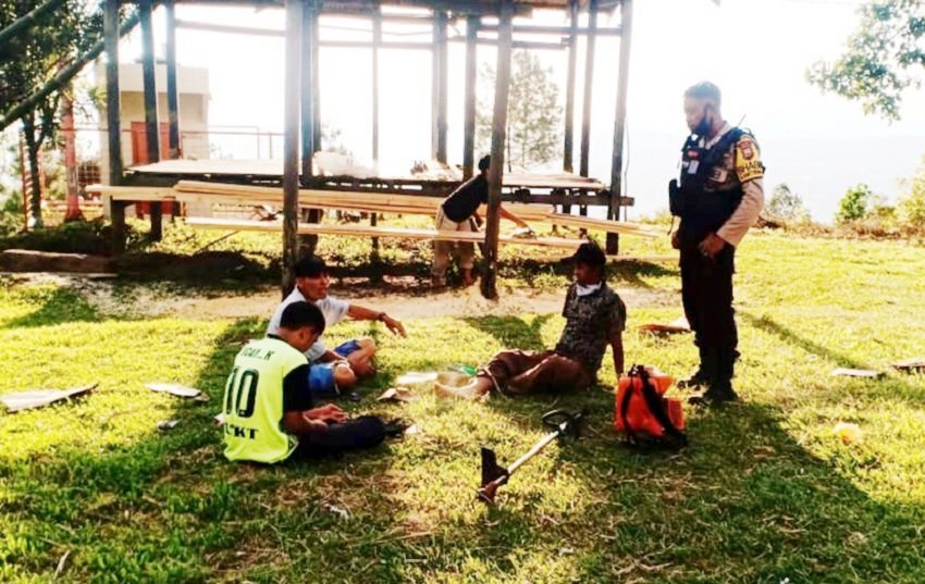 Bahu membahu personel kepolisian bersama masyarakat terlihat saat memotong kayu yang akan digunakan untuk pembuatan Kampung Rewako dan membersihkan dengan menggunakan alat pemotong rumput.