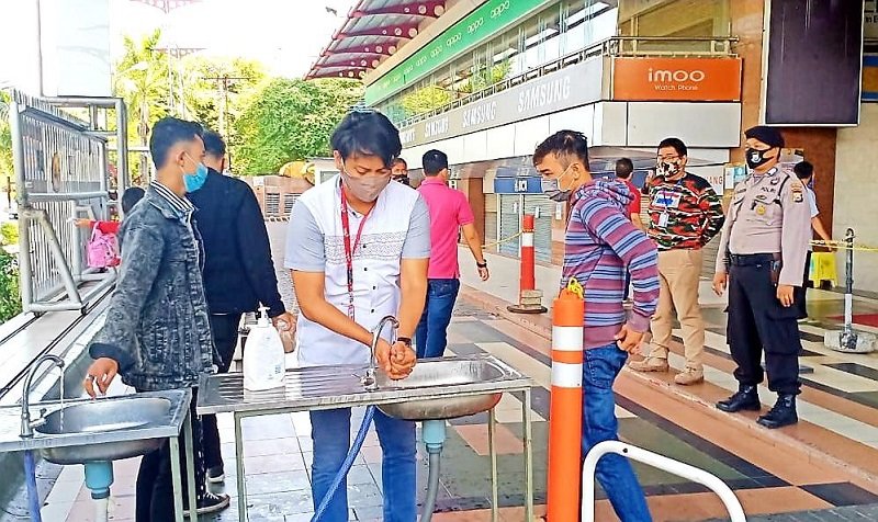 Kepolisian Resor (Polres) Pelabuhan Makassar bersama TNI menggelar patroli penertiban masyarakat di pusat perbelanjaan, Mal MTC Karebosi dalam rangka mencegah penyebaran Covid-19, Sabtu (25/07/2020).