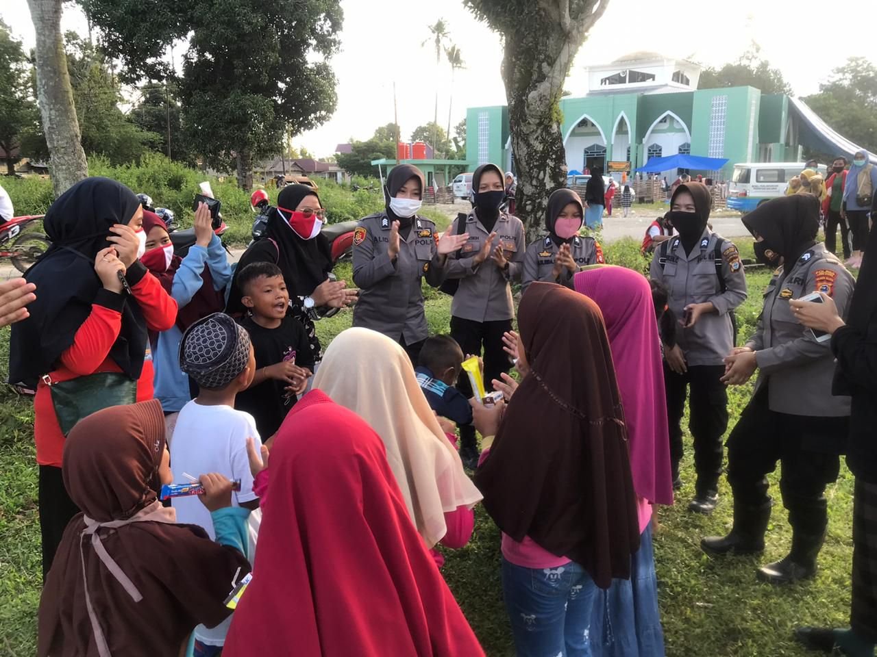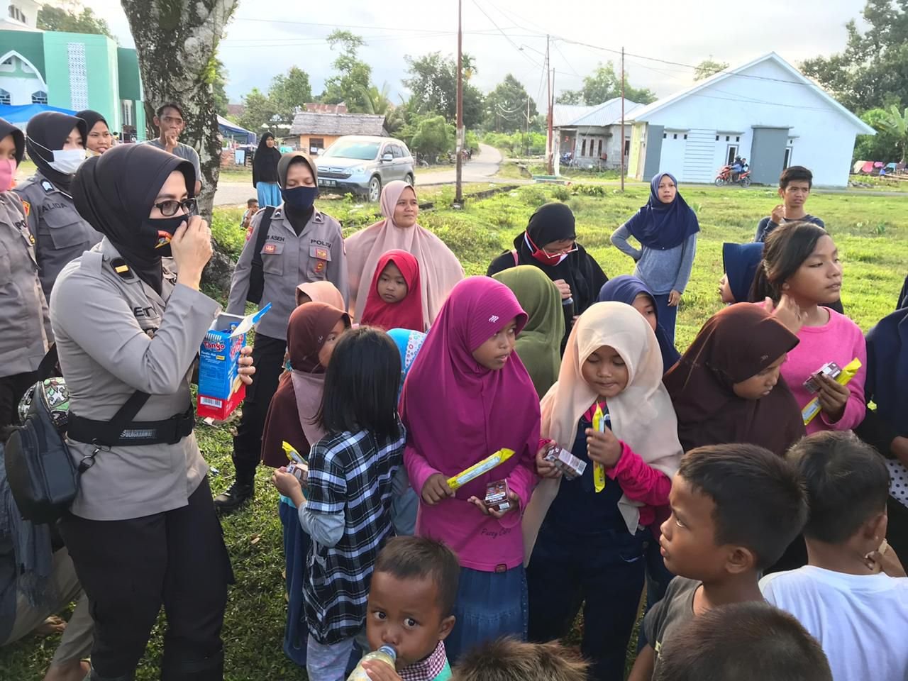 Polres Lutra menurunkan Polisi Wanita (Polwan) untuk pemulihan psikis dan memberikan bantuan di pengungsian Dusun Panampung, Desa Meli Kecamatan Baebunta, Jumat (24/7/2020).