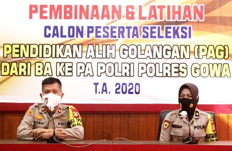 Dalam rangka sosialisasi jelang pembukaan seleksi Perwira Ahli Golongan (PAG) Polri tahun 2020, Polres Gowa melaksanakan kegiatan Pembinaan dan Pelatihan (Binlat) kepada para calon peserta seleksi Polres Gowa dan Polsek jajaran di Aula Endra Dharmalaksana, Selasa (28/07/2020).