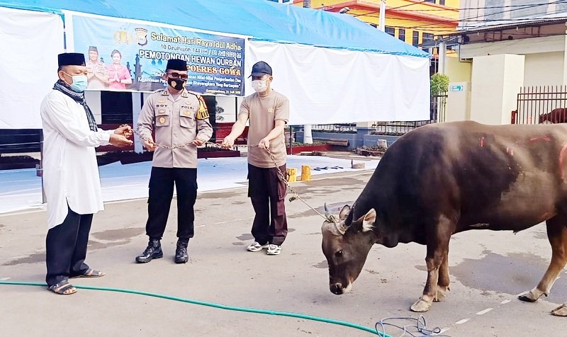 Mengawali pelaksanaan penyembelihan hewan qurban dalam rangka Hari Raya Idul Adha 1441 H, Kapolres Gowa AKBP Boy Samola pada Jumat (31/07/2020) pagi pukul 08.30 Wita menyerahkan hewan qurban secara simbolis kepada panitia pemotongan hewan qurban yang diterima langsung Kabagren Polres Gowa Kompol H. Mas'ud.