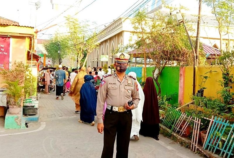 Guna terciptanya suasana yang aman dan nyaman bagi warga masyarakat yang hendak melaksanakan sholat berjemaah di Hari Raya Idul Adha 1441 H/2020 M, aparat keamanan dari Polres Pelabuhan Makassar dan jajarannya menerjunkan sebagian personel untuk memberikan pengamanan pelaksanaan sholat Idul Adha 1441 H hingga pemotongan hewan qurban yang dilaksanakan secara serentak di wilayah hukumnya, Jumat (31/07/2020).