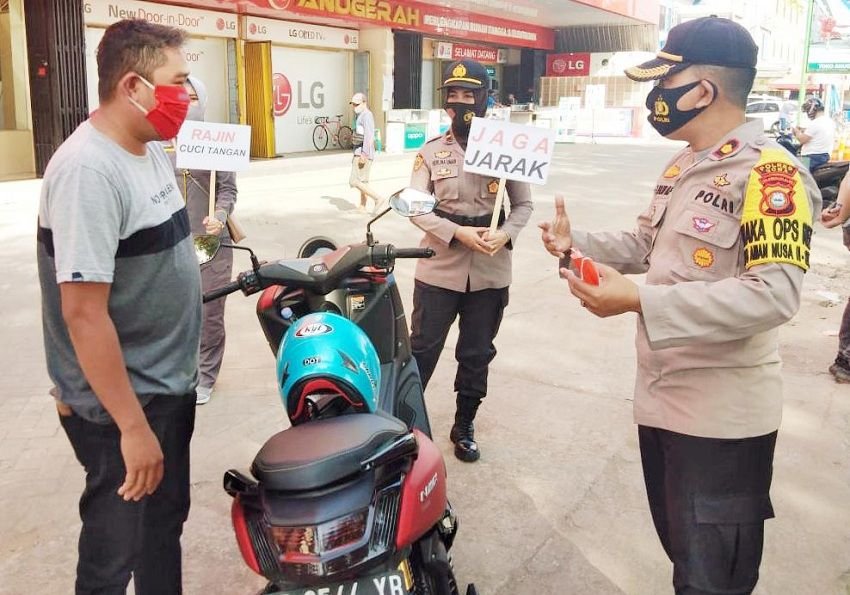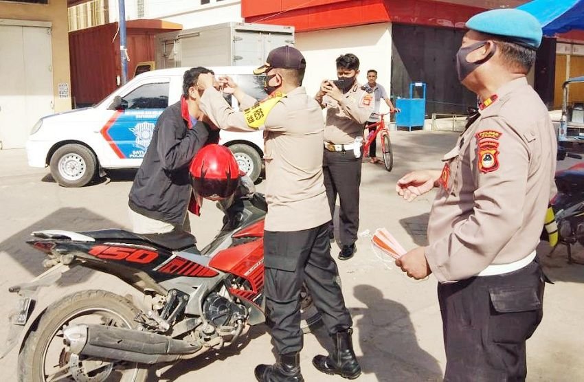 Tidak hanya memberi imbauan namun pemeriksaan terhadap setiap pengendara yang tidak menggunakan masker kemudian dihentikan lalu stok masker diberikan kepada warga secara cuma-cuma.