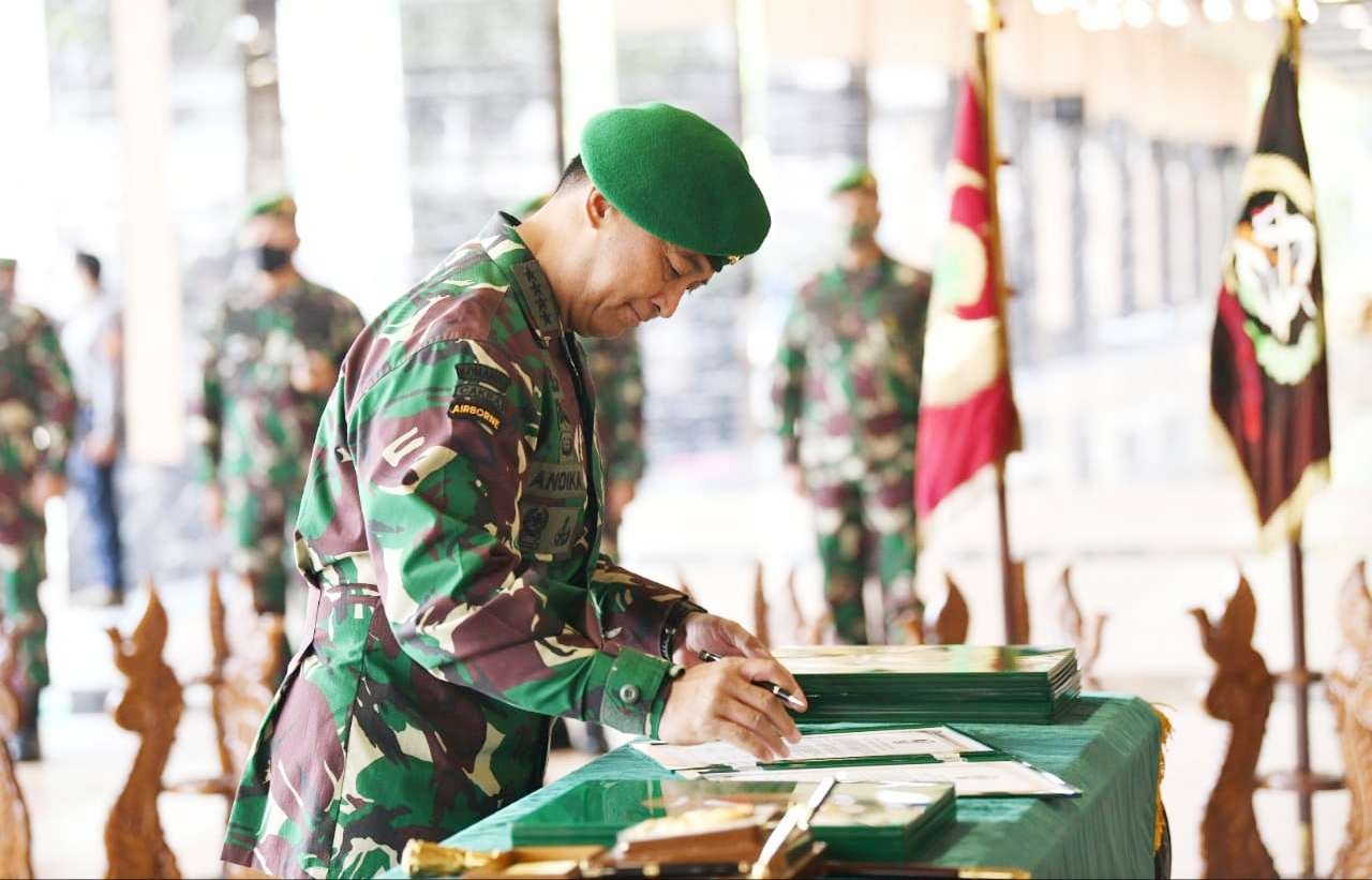 Kepala Staf Angkatan Darat (Kasad) Jenderal TNI Andika Perkasa memimpin acara Serah Terima Jabatan (Sertijab) 7 (tujuh) jabatan dan menerima penyerahan 2 (dua) jabatan penting lainnya di jajaran TNI Angkatan Darat bertempat di Lantai Dasar Gedung E Markas Besar Angkatan Darat, Jakarta, Kamis (06/08/2020).
