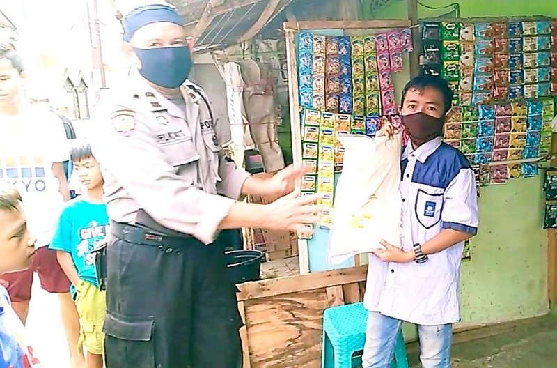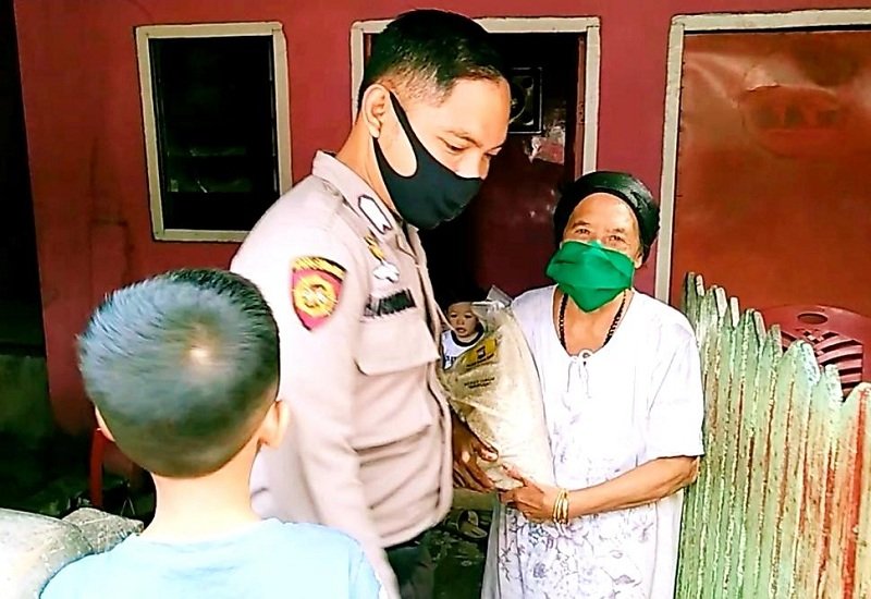 Dimasa pandemi Covid-19 yang masih mewabah di Kota Makassar, Kapolsek Ujung Tanah AKP Ridwan Saenong membagikan bantuan beras kepada warga terdampak Covid-19 yang berada di Jalan Bolu Kelurahan Patingalloang dan Jalan Barukang Utara Kelurahan Cambayya, Kecamatan Ujung Tanah, Kota Makassar, Jumat (07/08/2020).
