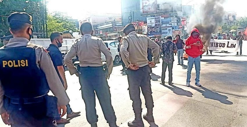 Para pengunjuk rasa dalam aksinya menggelar orasi menggunakan spanduk di titik tapal batas kota Gowa - Makassar dengan agenda tuntutan aksi unjuk rasa meminta dan menolak Omnibus Law (RUU Cipta Kerja) serta meminta kesejahterakan kelas proletariat dan penuhi hak buruh (Buruh Bukan Mesin, Tolak Investor Asing dan Fuck of Capitalism).