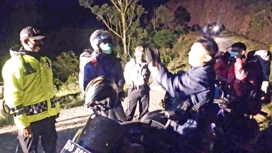 Malam semakin larut dan cuaca yang dingin tidak mengurangi kegiatan seorang Kapolsek bersama anggotanya dan relawan untuk memberikan imbauan kepada seluruh masyarakat yang hendak camping di Lembanna maupun ke puncak Gunung Bawakaraeng untuk selalu mengikuti protokol kesehatan.