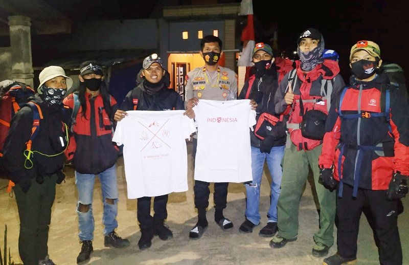 Kapolsek Tinggimoncong Polres Gowa Ipti Hasan Fadhlyh, SH menerima langsung baju kaos dari perwakilan pencinta alam sebagai ucapan terima kasih kepada pihak pengamanan dalam rangka Hari Ulang Tahun ke-75 Republik Indonesia, Sabtu (15/08/2020).