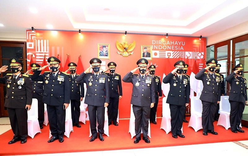 Kepala Badan Pemelihara Keamanan (Kabaharkam) Polri, Komjen Pol Agus Andrianto, beserta pejabat utama Baharkam Polri mengikuti Upacara Peringatan Detik-detik Proklamasi Kemerdekaan RI ke-75 secara virtual melalui video conference Zoom Meeting dari Gedung Baharkam Polri, Kompleks Mabes Polri, Jakarta, Senin, 17 Agustus 2020.