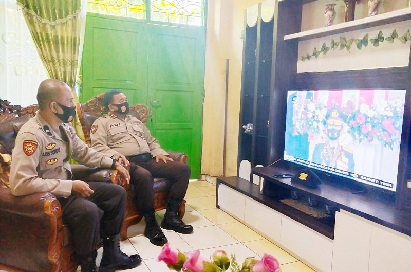 Meski dengan keterbatasan sarana, Kapolsek bersama personel Polsek Bungaya Polres Gowa menggelar nonton bareng melalui televisi siaran langsung pelaksanaan upacara Hari Hemerdekaan Republik Indonesia ke-75, Senin (17/08/2020).