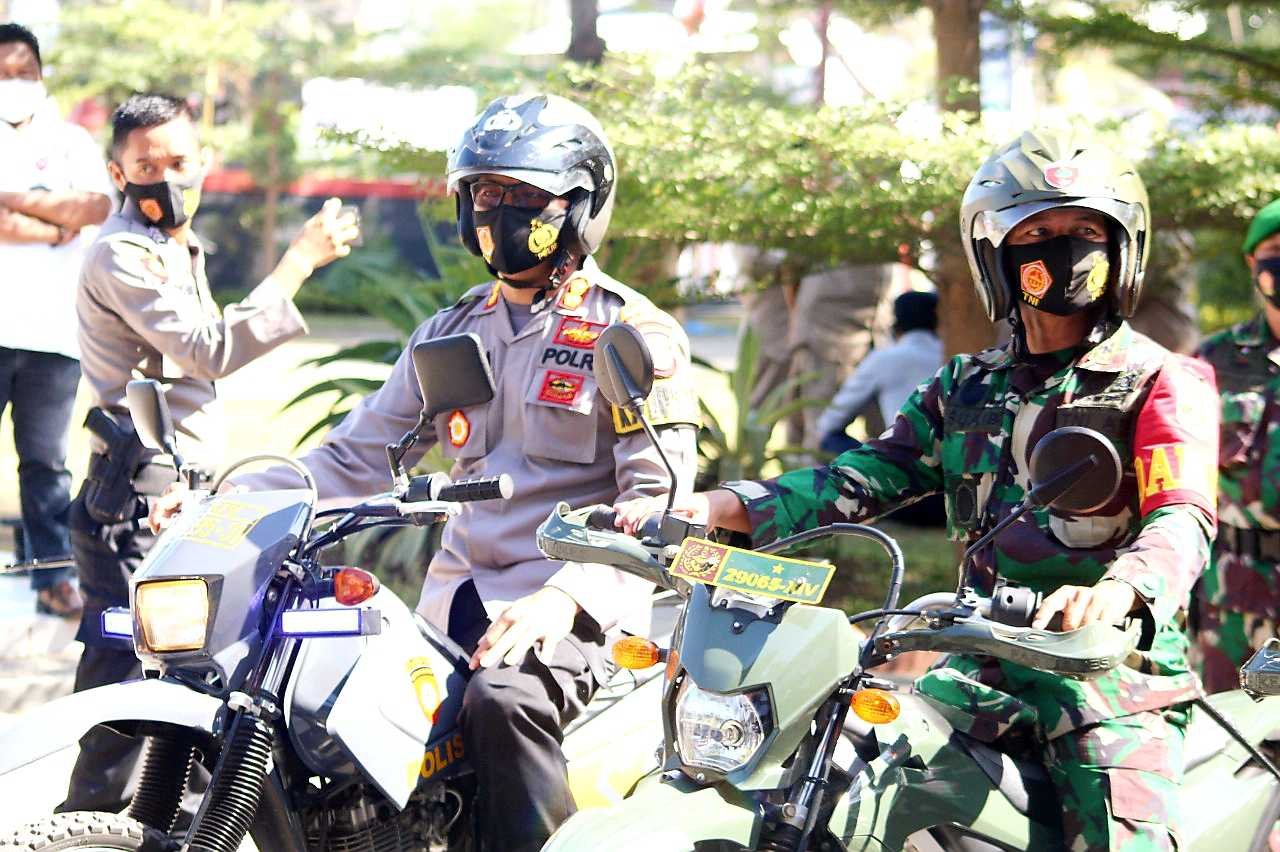 Personel Gabungan TNI-Polri dari Kodim 1409 dan Polres Gowa serta Pemerintah Kabupaten Gowa melaksanakan kegiatan Show Of Force mengelilingi Kota Sungguminasa, Kabupaten Gowa dalam rangka mengawali kegiatan Operasi Penegakan dan Pendisiplinan Protokol Kesehatan Dalam Wilayah Kabupaten Gowa, Rabu (19/08/2020).