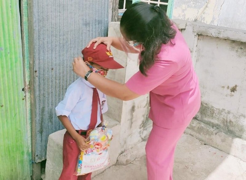 Bakti sosial tersebut dalam bentuk kegiatan membagikan bingkisan kepada 20 siswa SD berupa perlengkapan mandi dan masker di Pulau Kambuno, Desa Pulau Harapan, Kecamatan Pulau Sembilan, Rabu (26/08/2020).