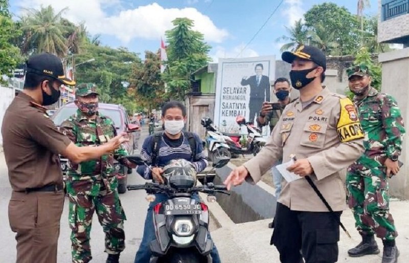 Pembagian masker dan langsung dipasangkan kepada pengguna jalan dilakukan bersama oleh Kapolres Kepulauan Selayar AKBP Temmangnganro, Kajari Selayar Adi Nuryadin Sucipto, Dandim 1415 Selayar Letkol Kav Adi Priatna, dan Ketua PN Selayar Fatkur Rochman.