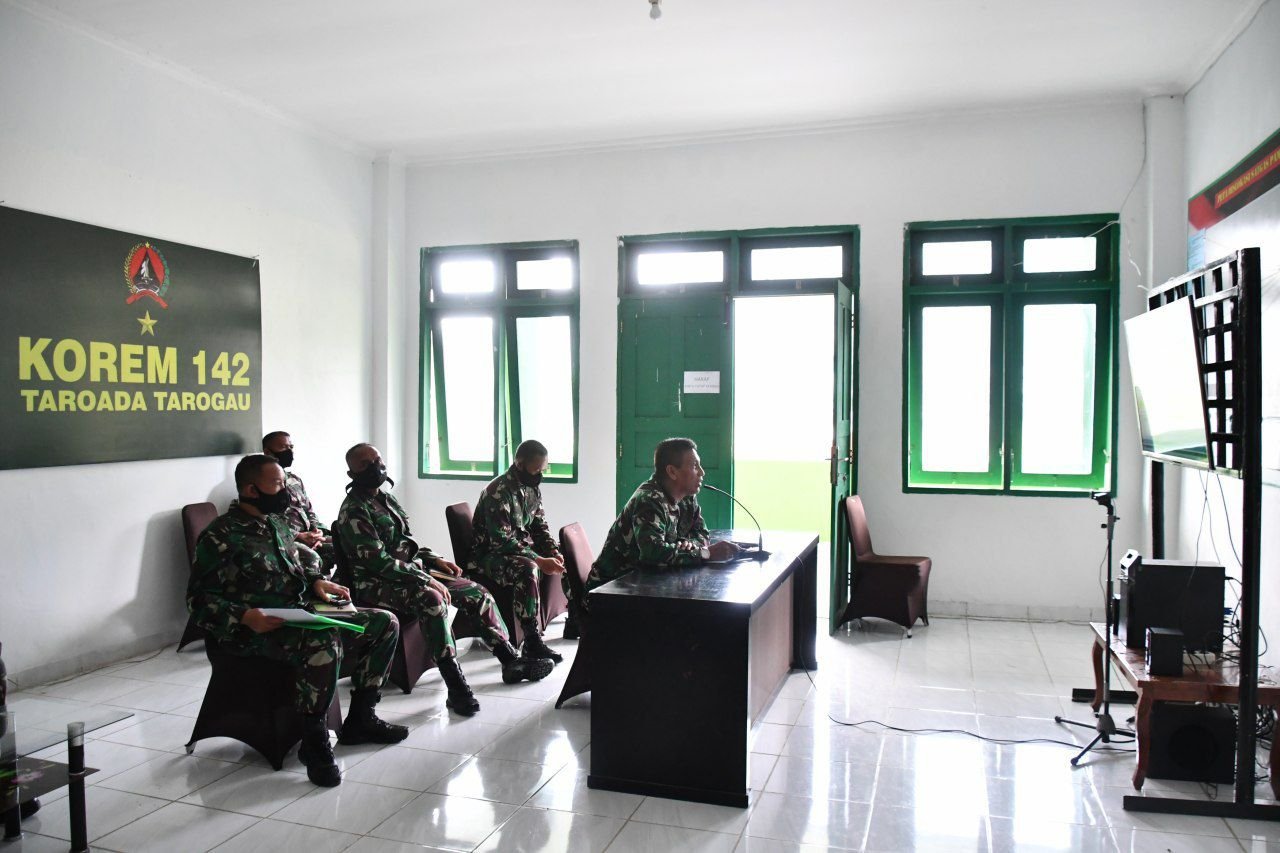 Danrem 142/Tatag Brigjen TNI Firman Dahlan, S.I.P video conference dengan Kasdam XIV/Hasanuddin Brigjen TNI Andi Muhammad, SH tentang kesiapan Pilkada di wilayah Korem 142/Tatag, bertempat diruang vicon lantai 2 Korem 142/Tatag. Jumat (28/8/2020).