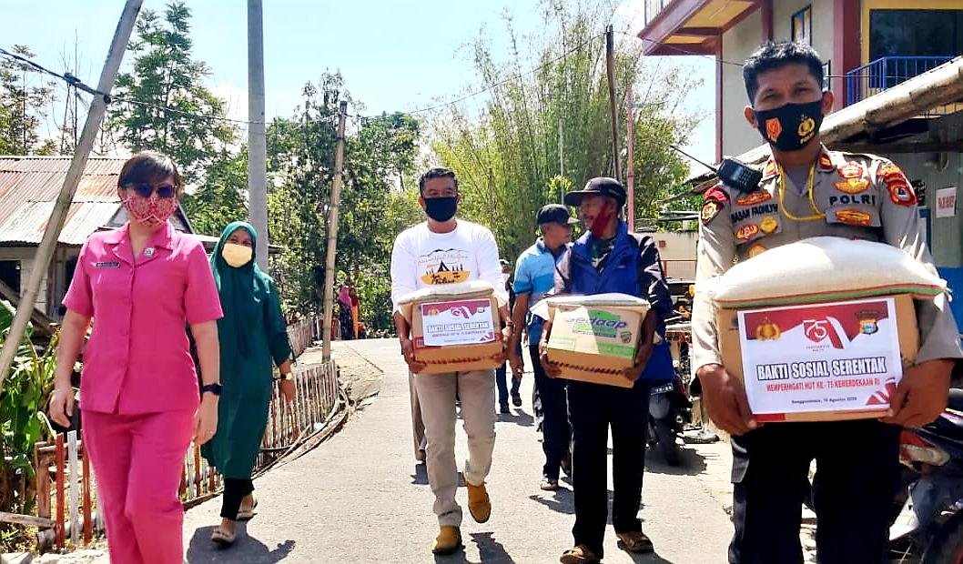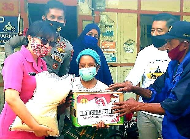 Ketua Bhayangkari Gowa Ny Ana Boy Samola didampingi Kapolsek Tinggimoncong Iptu Hasan Fadhlyh, SH menemui langsung warga prasejahtera di Lengkese, Desa Manimbahoi, Kecamatan Parigi, Minggu (30/08/2020).