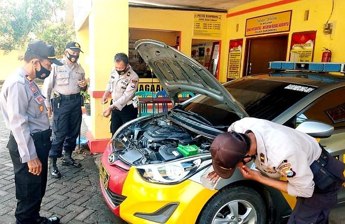 Kapolsek Barombong mengecek langsung utamanya olie, rem, dan air radiator untuk memastikan ranmor dinas itu siap pakai dalam menunjang tugas.