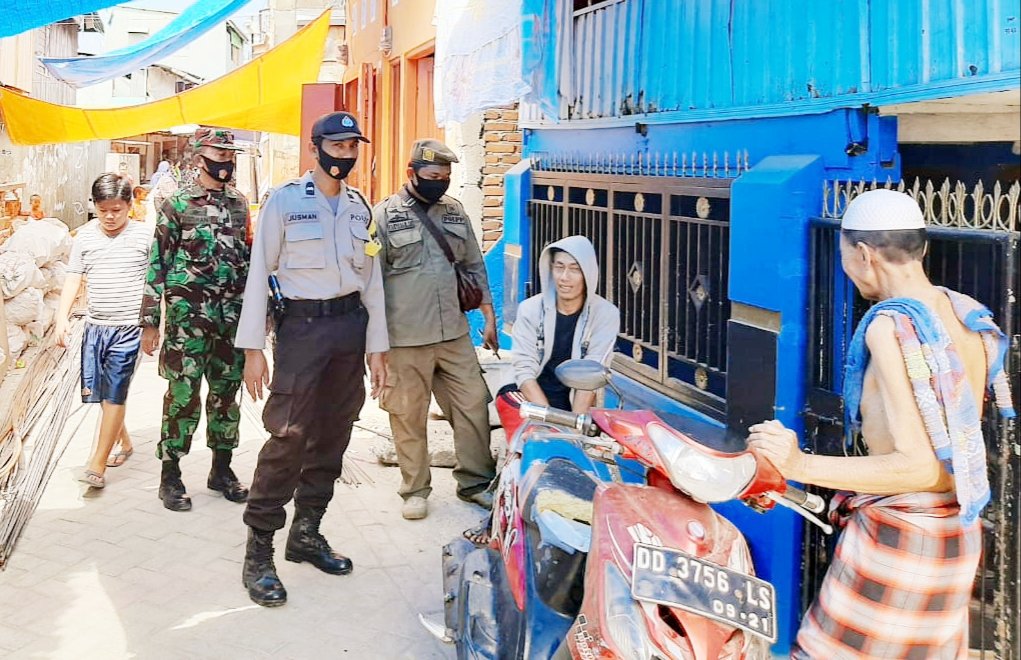 Tampak kompak Bhabinkamtibmas Polres Pelabuhan Makassar bersama Babinsa dan Satpol PP memberikan arahan dan teguran kepada warga yang tidak menggunakan masker selama beraktifitas.