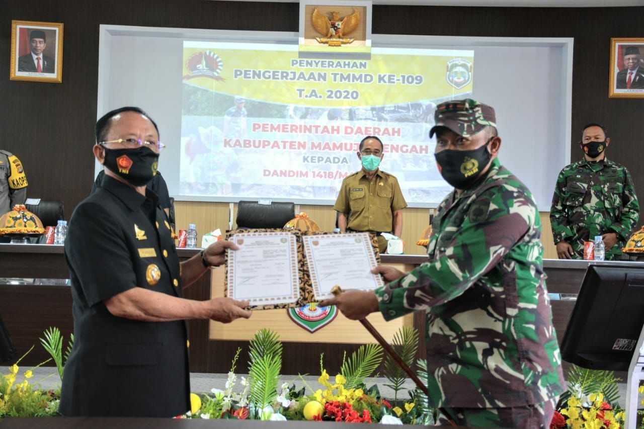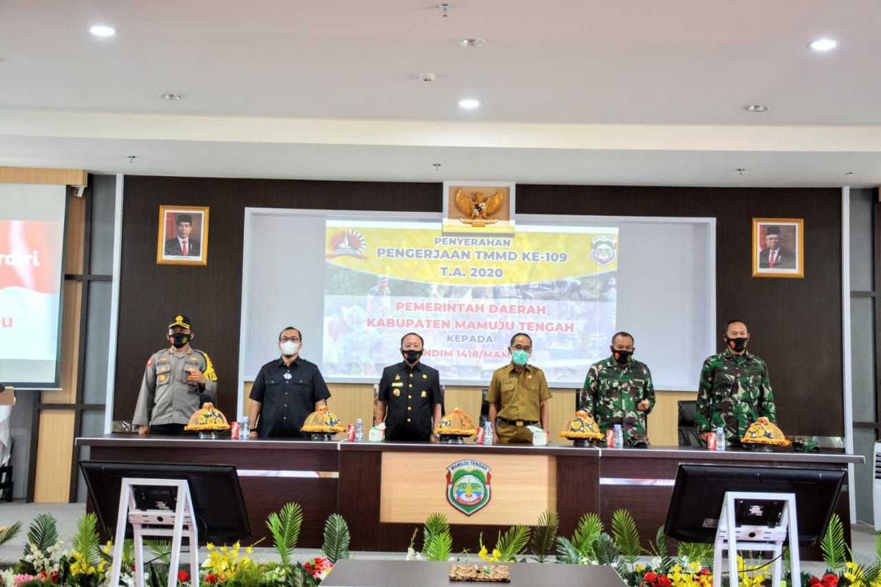 Pembukaan TMMD ke-109 TA 2020 Kodim 1418/Mamuju sekaligus penandatanganan dan penyerahan berita acara serah terima Program TMMD dilaksanakan di Aula Kantor Bupati Mamuju Tengah oleh Bupati Mamuju Tengah H. Aras Tammauni dan Komandan Kodim 1418/Mamuju Letkol Inf Tri Aji Sartono, Selasa (22/9/2020)