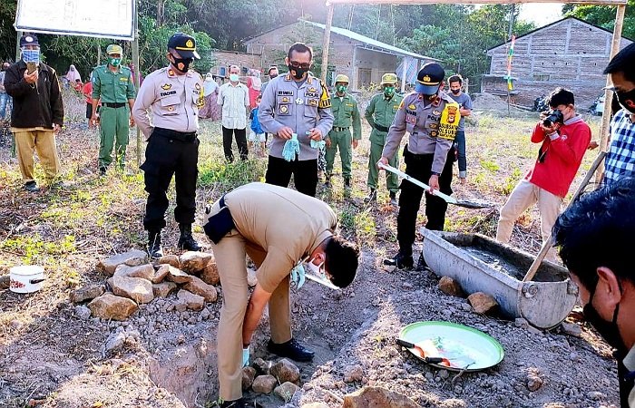 Di sela kunjungan kerja di Kampung Rewako Desa Tanrara, Kecamatan Bontonompo Selatan, Forkopimda Kabupaten Gowa menyempatkan untuk melakukan peletakan batu pertama pembangunan kantor Polsubsektor Bontonompo Selatan Polres Gowa, Senin (21/09/2020) sore.