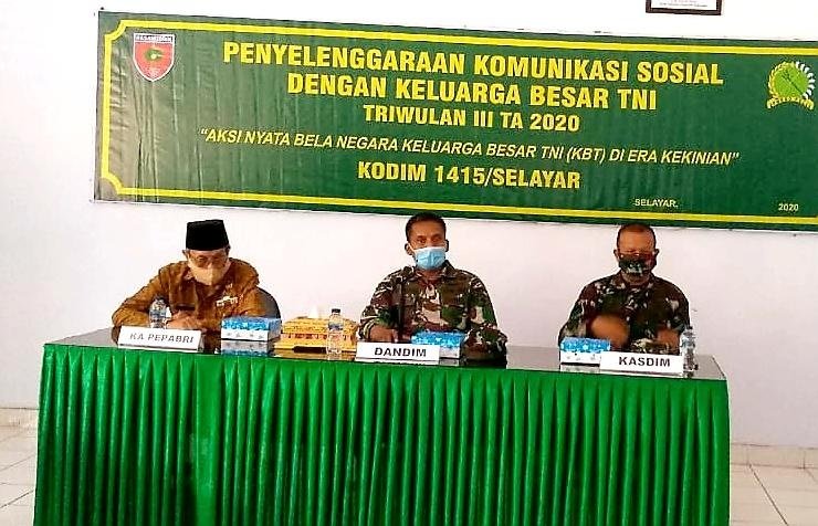 Acara pertemuan ini mengambil tema "Penyelenggaraan Komunikasi Sosial dengan Keluarga Besar TNI Triwulan III TA 2020 Aksi Nyata Bela Negara Keluarga Besar TNI (KBT) di Era Kekinian Kodim 1415 Selayar".