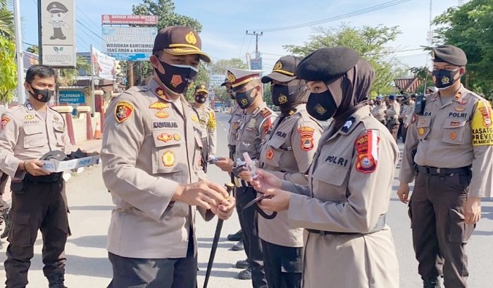 Sebagai wujud kepedulian terhadap anggotanya, Kapolres Pelabuhan Makassar AKBP Muhammad Kadarislam Kasim membagikan masker dan hand sanitizer kepada personelnya yang akan melaksanakan pengamanan Kampanye Pilkada Serentak 2020.