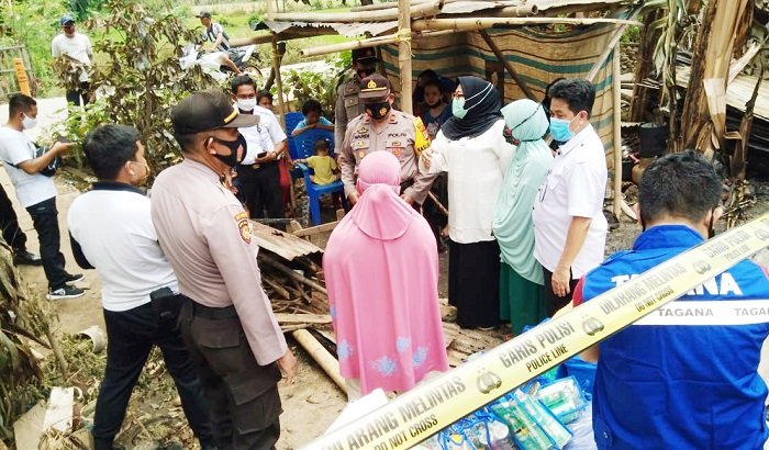 Kapolsek Bajeng Polres Gowa Iptu Sunardi, SH, MH bersama Camat Bajeng Haerani Mallingkai, S.Sos, mendampingi tim dari Dinas Sosial Kabupaten Gowa, menyerahkan bantuan kemanusiaan kepada korban kebakaran di Dusun Bukkangraki, Desa Pabbentengang, Kecamatan Bajeng, Kabupaten Gowa, Rabu (30/09/2020) siang.