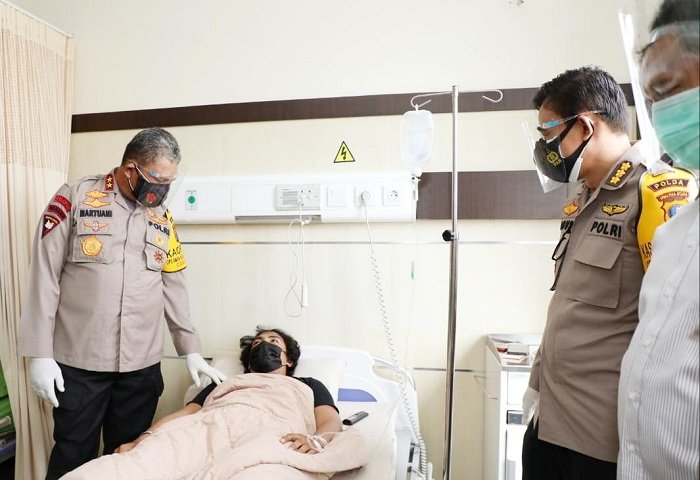 Kepala Kepolisian Daerah (Kapolda) Sumatera Utara (Sumut), Irjen Pol Martuani Sormin, menjenguk personel yang terluka saat mengamankan aksi demo anarkis dan kini dirawat di Rumah Sakit Bhayangkara Polda Sumut, Sabtu (10/10/2020).