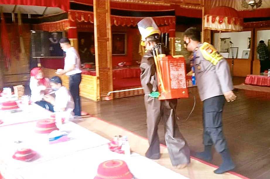 Untuk mengantisipasi penyebaran Covid-19 di lokasi destinasi wisata Museum Balla Lompoa yang ada di Kabupaten Gowa, Polres Gowa melakukan pencegahan dengan melakukan penyemprotan cairan disinfektan.