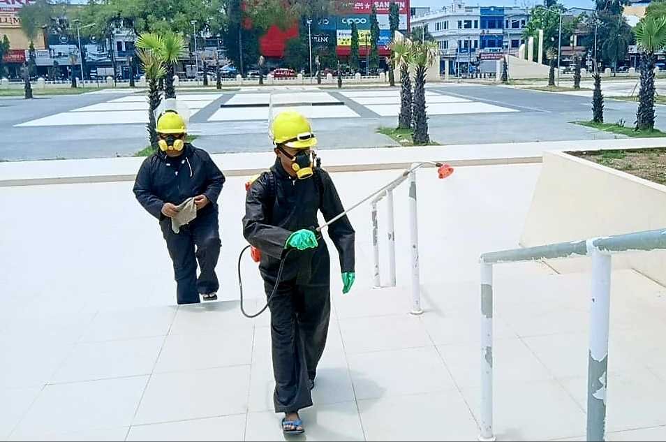 Titik penyemprotan yang dilakukan pada siang tadi Rabu (14/10/2020) pukul 11.00 Wita diantaranya pada bagian pelataran dan ruangan tempat dilakukannya penyambutan.